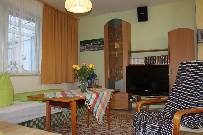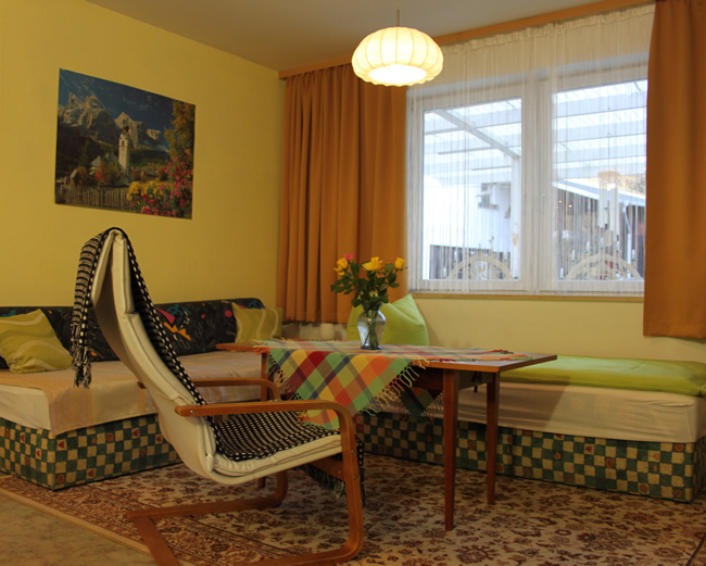 Sitzecke mit 2 Polsterliegen (für Aufbettungen), TV mit Satellitenanschluss
