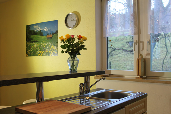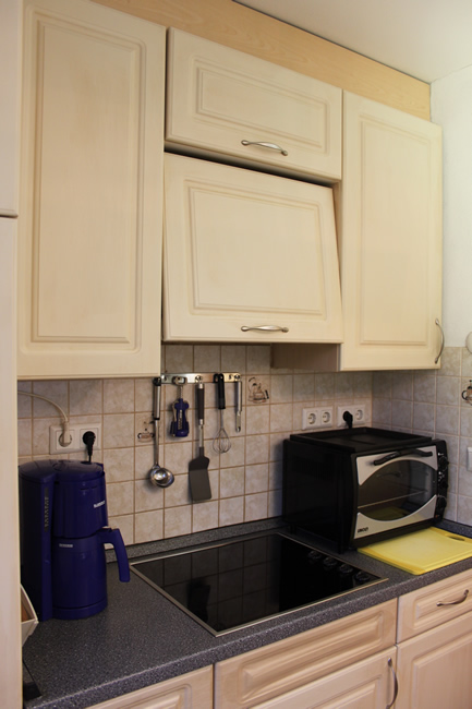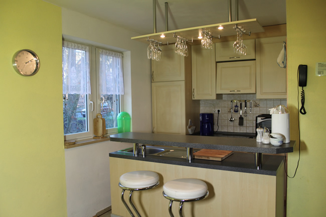 Küche mit Ceranfeld, Spülmaschine, Kühlschrank, Kaffeemaschine, Wasserkocher,