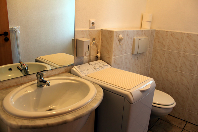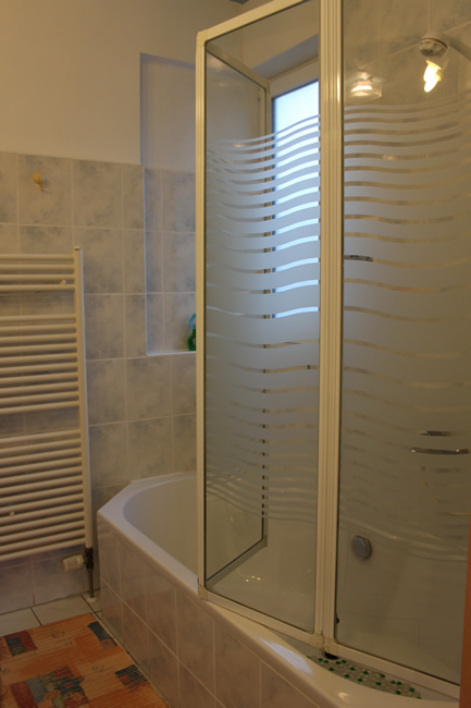 praktisch ausgestattetes Wannenbad/ Dusche mit Fön, WC,
