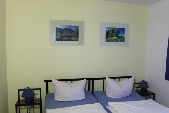 Schlafraum mit 2 Betten und KinderbettWohnraum mit Essecke und amerikanischer Küche